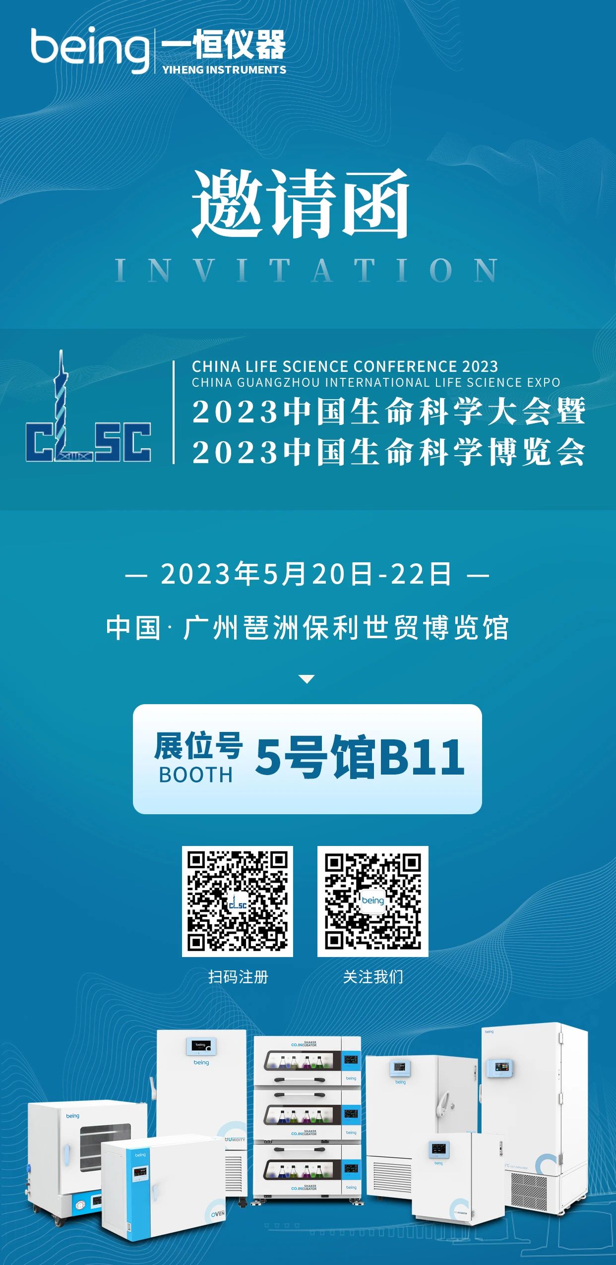 我们诚挚邀请您参加此次展会并欢迎莅临我们展位:5号馆B11。届时,我们将现场展示低温振荡二氧化碳培养箱、生物安全柜、叠加式振荡器、液相液氮罐、摇床、磁力搅拌器等产品,期待与您现场交流。