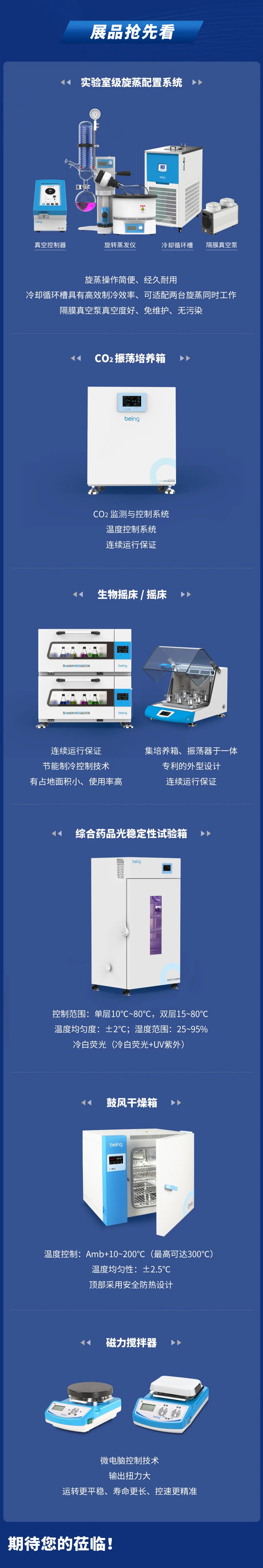 本次展会,我们将携二氧化碳振荡培养箱、实验室级旋转蒸发仪和配套系统、综合药品光稳定性试验箱、干燥箱、摇床、磁力搅拌器等优质产品与解决方案,精彩亮相S4D16展位。