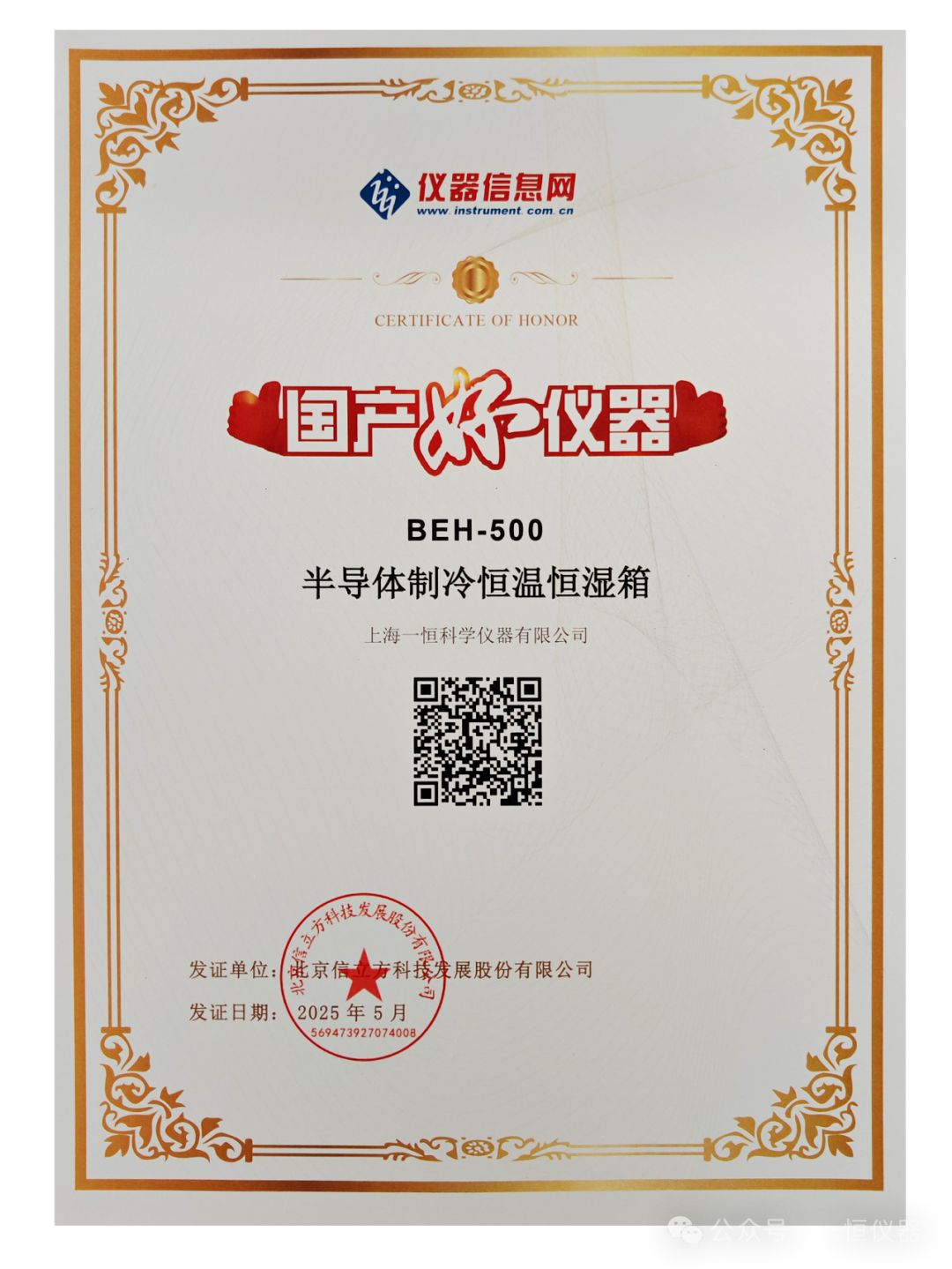 “国产好仪器” 2025年度榜单 丨上海一恒科学仪器有限公司半导体制冷恒温恒湿箱实力入选