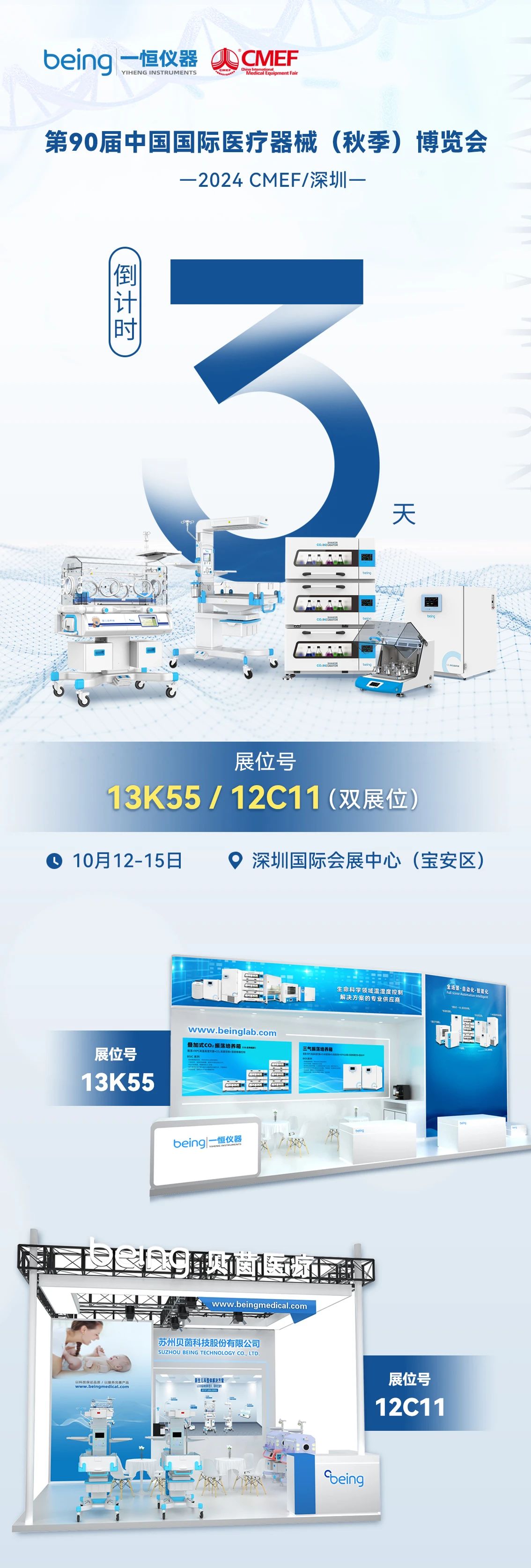 新闻资讯 您当前的位置:首页 > 新闻资讯 > CMEF倒计时,一恒仪器 CMEF倒计时,一恒仪器诚邀您鹏城相聚 2024-10-09 | 文章来源: | 点击率: 第90届中国国际医疗器械(秋季)博览会(CMEF)倒计时3天。我们将携多款明星产品和新一代半导体系列设备在深圳国际会展中心闪耀亮相,为了更全面、多角度地展示我们的产品和技术,本次展会我们设置双展位:13K55/12C11,诚邀您一起领略创新产品魅力,期待您的莅临和交流! 展会时间和地点: 时间:2024年10月12-15日 展馆:深圳国际会展中心(宝安区) 地址:深圳市宝安区福海街道展城路一号 上一篇: 【邀请函】一恒仪器与您相约11月慕尼黑上海分析生化展 下一篇: 【展会新闻】ARABLAB2024圆满落幕,贝茵期待与您再次相遇 相关新闻: 【公司新闻】与您相约春天 3月展会预告 生物安全培养箱 培养数据有底气 【公司新闻】“一马当先 恒启新程”贝茵科技2026年会暨颁奖典礼圆满收官 恭喜贝茵二氧化碳培养箱入选仪器信息网2025二氧化碳培养箱热度榜单Top10 【公司通知】关于2026年春节放假的通知 给药品先做个“体检” 半导体制冷综合药品光稳定性试验箱 分享到微信新浪微博腾讯微博人人网QQ好友0 返回新闻列表 >>