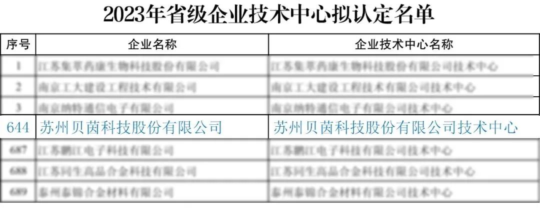 近日,江苏省2023年省级企业技术中心拟认定名单现已公示结束,苏州贝茵科技股份有限公司成功入选。